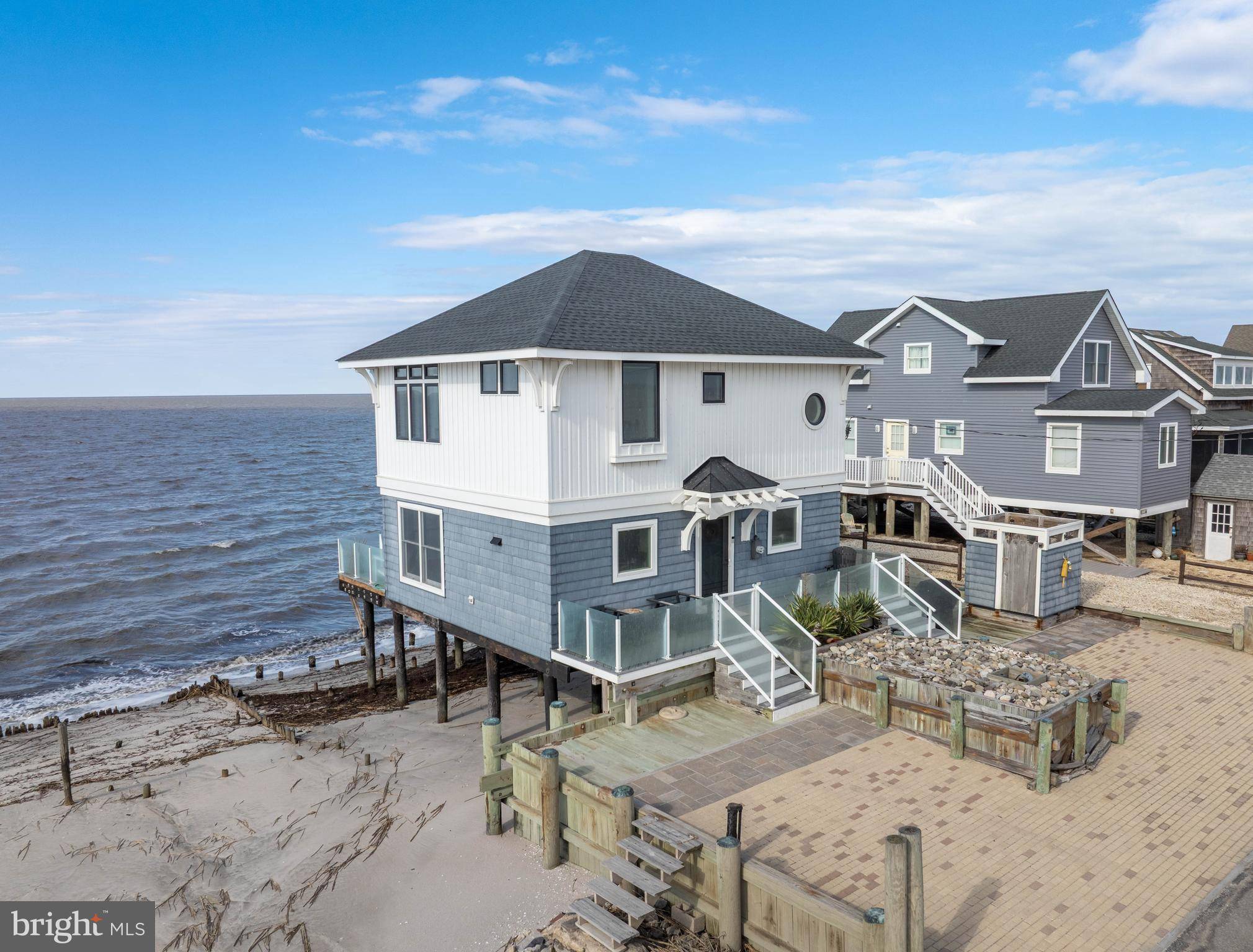 Experience luxury coastal living in this one-of-a-kind waterfront home, perched directly on the beach with breathtaking panoramic views of the Delaware Bay. From sunrise reflections to the most amazing sunsets, this home delivers tranquility and sophistication. This quintessential bay front home experienced an extensive interior and exterior renovation in 2022-2023 which included the demo and reconstruction of the 2nd floor and interior renovation of the 1st floor. A new brick paver driveway leads to a coastal design exterior featuring glass rails for unobstructed views on both sides of the house with gated sections securing children and pets. The Ebay (Japanese Mahogany) decking and glass-bottom area on the beach side deck provide a truly unique way to see the water beneath your feet. Custom outdoor benches with cushions create an ideal seaside lounge. The antique cypress wood outdoor shower with carved wave details adds to the coastal charm of this property. Inside you'll find luxury Pergo vinyl flooring, custom lighting throughout and Quartz countertops and backsplash. The open kitchen area features all new appliances including a Bosch washer and dryer. The home is equipped with spray insulation; a new high velocity HVAC system and LED dimmable lighting. The primary bedroom offers sweeping bay views from your bed and a custom closet with built-in shelving. The spa-like full main bath features a floating vanity, vessel sink, glass shower doors and contemporary fixtures. This bath also has a generously sized linen closet. The spare bedroom features large windows for more massive water views. The home office doubles as a quest space that the owners use as extra sleeping quarters. Additional amenities throughout the home include custom Sun window shades, a half bath on the 1st floor with designer finishes, ample attic space (climate controlled), and accent lighting along soffits for evening ambience. Just step outside and at high tide you can fish or crab right off of your private deck, end your day paddle boarding at sunset or just relax after a day at any of the nearby beaches. Just minutes from Stone Harbor, Avalon, the Wildwoods and Cape May, you'll enjoy the best of both worlds – fine dining and entertainment close by, with peaceful seaside living when you return home. Wake up to the sound of waves, enjoy the glow of the sunsets, this special home is an ultimate Delaware Bay retreat. *Last 5 photos are some of the renovation photos.