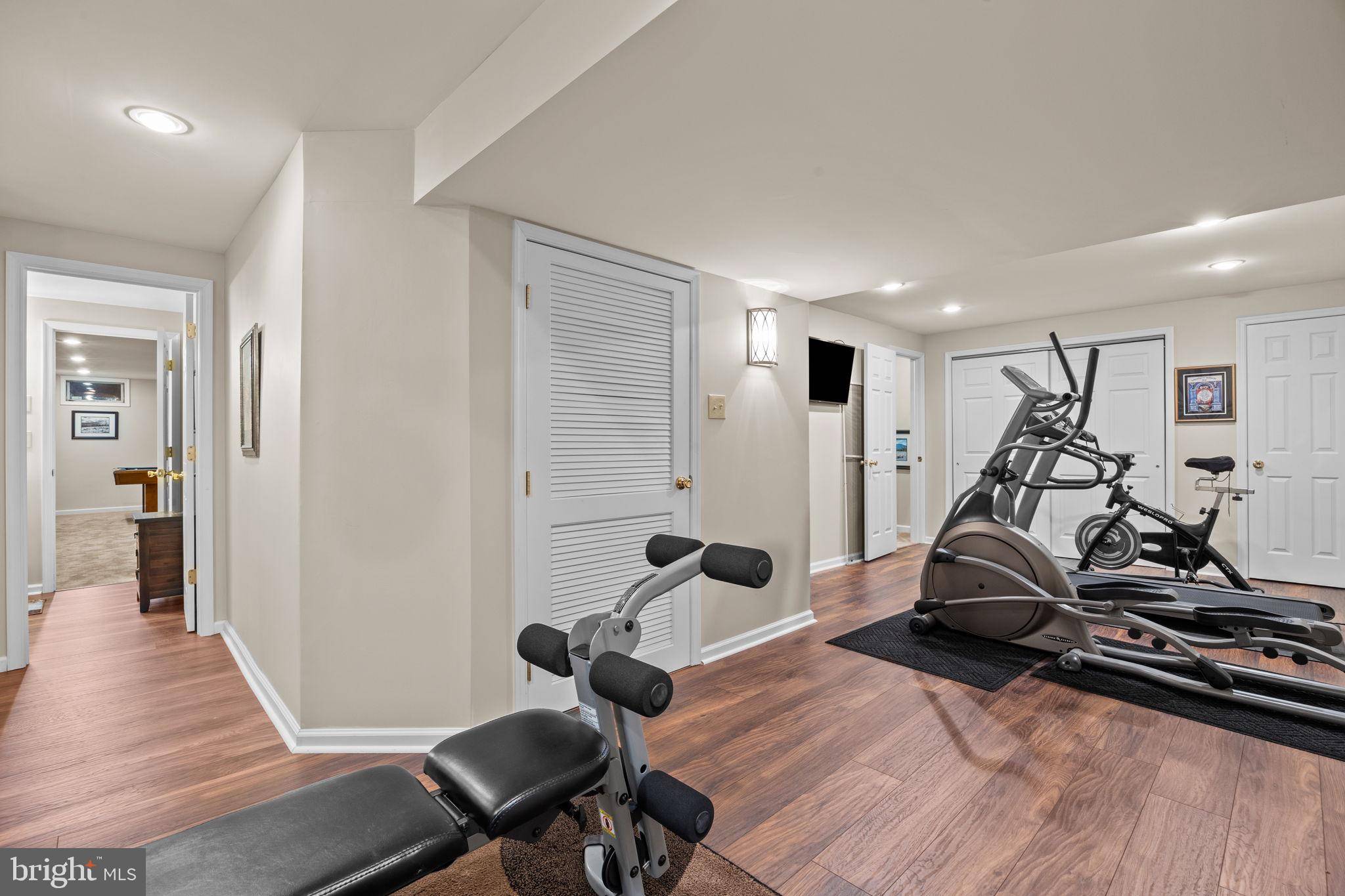 The large finished basement expands the living space with multiple functional areas, including a great room ideal for games or movie nights, an exercise room, a home office, a bathroom, and a dedicated workshop.